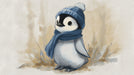 Create a gentle and nurturing environment with this beautiful wallpaper, featuring a baby penguin rendered in a soft watercolor style. The penguin, wearing a cozy blue beanie and scarf, stands in a field of abstract, golden-brown grass. The brushstrokes are loose and artistic, blending the cool blues of the clothing with the warm, earthy tones of the background. This illustration evokes a sense of tenderness, nature, and artistic elegance, perfect for adding a calming touch to nurseries, bedrooms, or reading nooks.