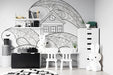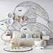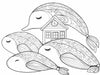 Whales and House Coloring Book Art Black White Line Drawing Mural Wallpaper | Folk Art Style, Peaceful