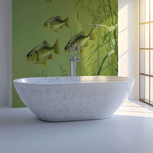 VivawallsEn el baño, el papel tapiz muestra un patrón de hojas blancas sobre un fondo verde claro. La gran bañera independiente con una textura moteada se e...