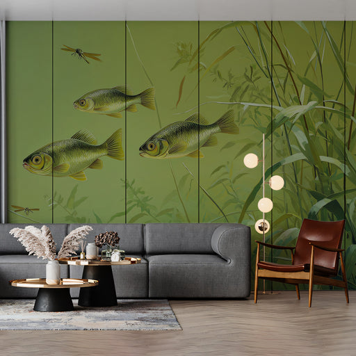 Ver todos los detallesMural de arte de estanque de carpas doradas | Pintura tradicional de peces con libélulas