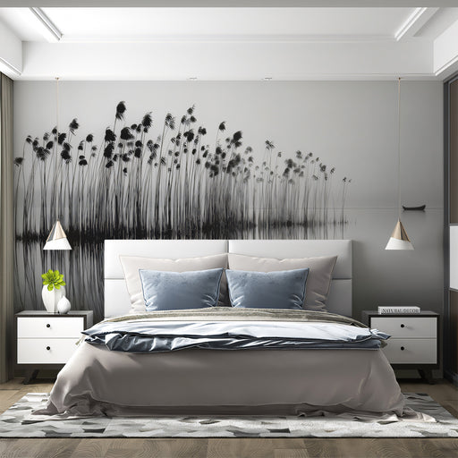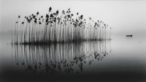 Papel pintado de lago con cañaveral tranquilo | Paisaje monocromático sereno con barco