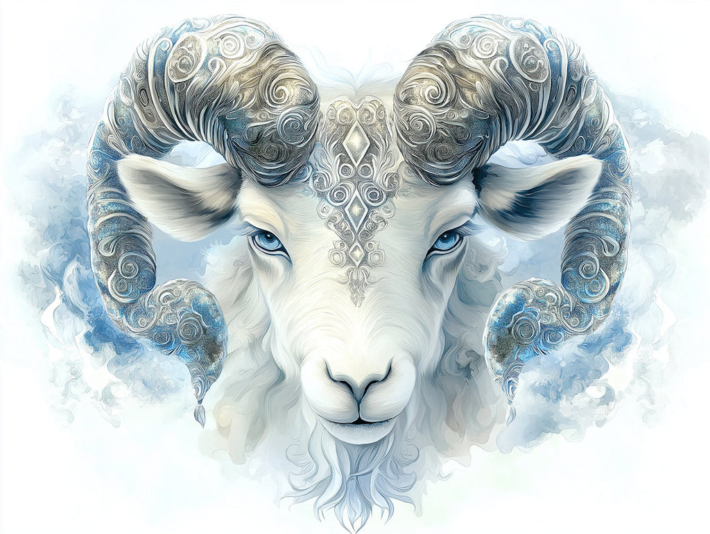 El esquema de colores azul claro y blanco del carnero crea una base suave y relajante, mientras que los intrincados patrones en los cuernos añaden profundidad e interés visual. El llamativo azul de los ojos proporciona un punto focal y un toque de color. El fondo azul claro complementa los colores del carnero, creando una composición armoniosa y equilibrada. La paleta de colores general evoca una sensación del cielo y el aire, lo cual es adecuado para el signo de fuego Aries, que representa el comienzo del ciclo zodiacal y una sensación de nuevos comienzos.