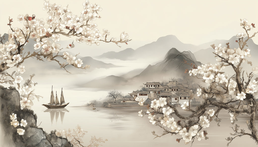 Este sereno Papel Tapiz Mural de Flor de Ciruelo Chino trae una sensación de calma profunda y elegancia artística a cualquier espacio. El diseño presenta una delicada rama floreciente con hermosas flores blancas enmarcando una escena tranquila. El telón de fondo es un paisaje suave y brumoso con una aldea tradicional y un velero en una masa de agua serena, todo representado en una paleta monocromática suave de gris apagado y blanco roto. La simplicidad y armonía de la composición evocan una sensación de profunda tranquilidad. Este papel tapiz es una elección ideal para crear un refugio pacífico en un salón, un sereno dormitorio, o un tranquilo estudio.