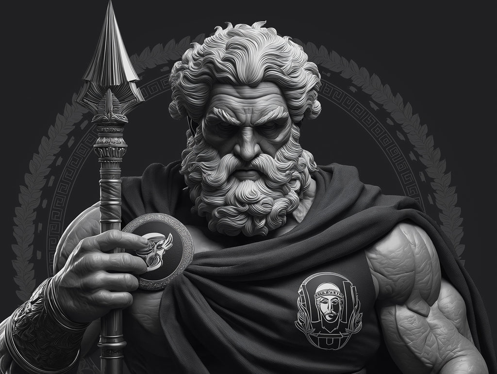 Nuestro Papel Tapiz de Muro Dios Griego encarna la fuerza, la mitología y la grandeza atemporal. Esculpidos en un llamativo monocromático, la figura central se erige como Zeus renacido: barbado, armado y sosteniendo una lanza divina y un medallón. Cada pliegue de su capa y línea en su brazo hablan del poder forjado a través de la eternidad.