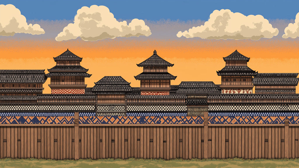 Los tonos cálidos del naranja en el cielo contrastan con los marrones y negros terrosos de los edificios, mientras que sutiles nubes beige añaden equilibrio. La paleta refleja los tonos naturales del atardecer, fusionando calidez y tradición sin esfuerzo.