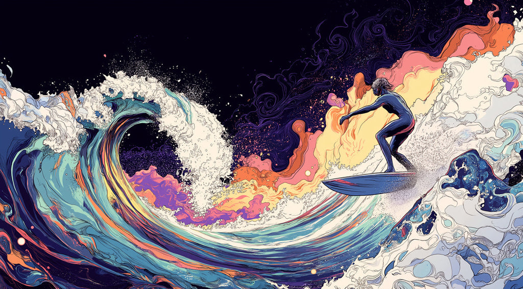 Este papel tapiz muestra a un surfista montando una ola contra un fondo cósmico lleno de colores vibrantes y patrones giratorios. En un baño, crea una atmósfera mística y vibrante, añadiendo un toque de otro mundo al espacio.