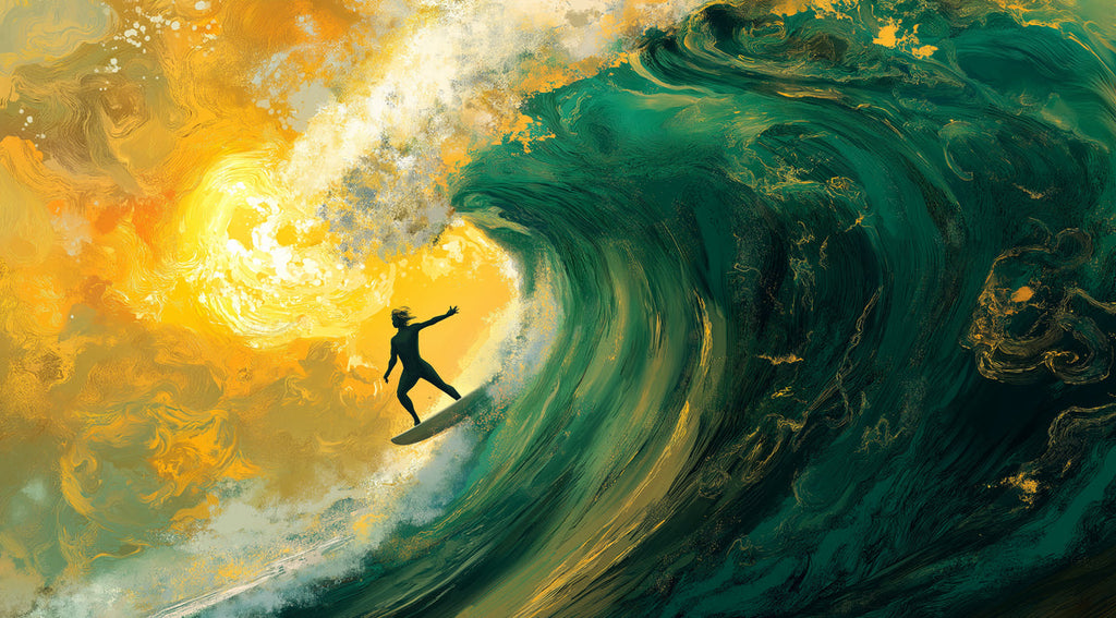 Los ricos verdes y dorados de la ola contrastan con la silueta del surfista. Una bañera blanca proporciona una base limpia y neutra que hace que los colores del mural destaquen. Los accesorios de baño en tonos dorado u verde pueden complementar el esquema de colores.