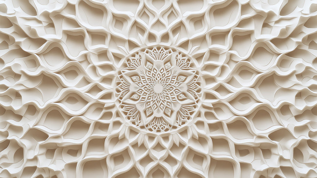 Agrega un margen de seguridad de 6 a 10 cm. El área total se calcula en metros cuadrados y se redondea al número entero más cercano.Papel tapiz mural de madera 3D Mandala en el dormitorio | Diferentes tonos de marrón Mandala para el budismo