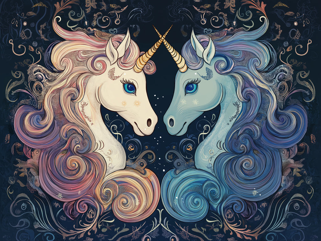 Los tonos suaves de rosa y azul de las crines del unicornio crean un contraste delicado y onírico contra el fondo azul oscuro. Los cuernos dorados añaden un toque de lujo y destacan contra los tonos más fríos. Los patrones celestiales en azul claro y blanco en el fondo mejoran la sensación cósmica general, creando un esquema de colores armonioso y visualmente atractivo que evoca una sensación de asombro y magia.