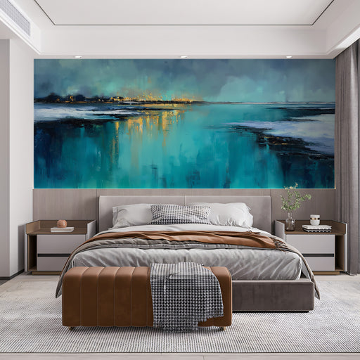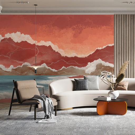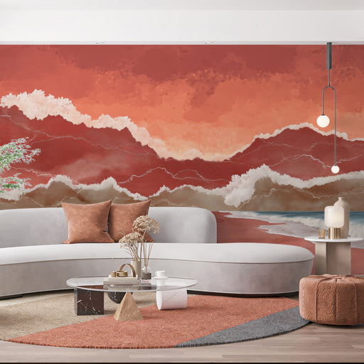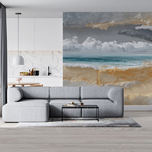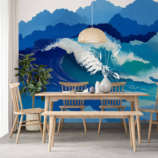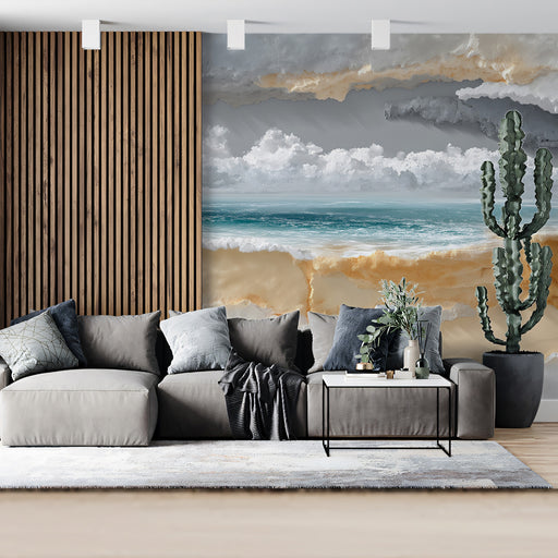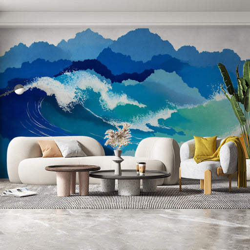 El estilo es artístico y juguetón, con un enfoque en un motivo de playa y vida silvestre. Este papel tapiz sería ideal para un dormitorio con una decoración contemporánea, temática de playa o adecuada para niños. También podría funcionar bien en un salón o un despacho para mejorar la atmósfera vibrante y artística.