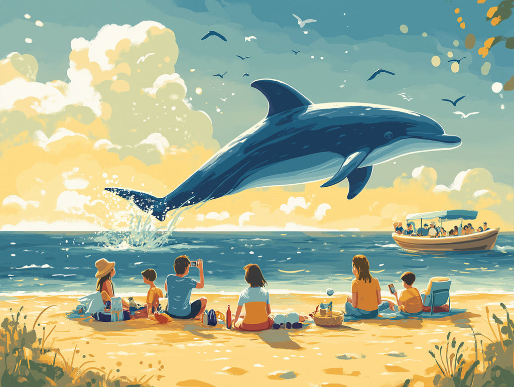 Este fondo de pantalla muestra un delfín saltando fuera del agua con personas en la playa mirando y un barco en la distancia. El diseño es animado y agrega una vibra divertida y playera al dormitorio. Puede hacer que el espacio se sienta más alegre y conectado con el océano.
