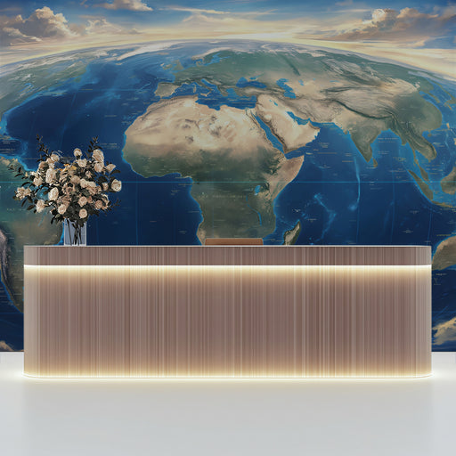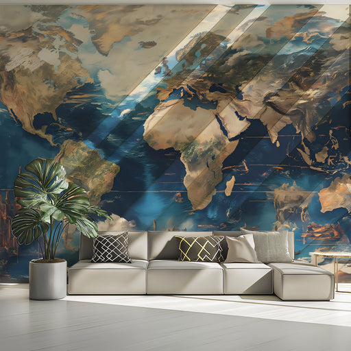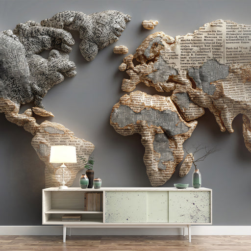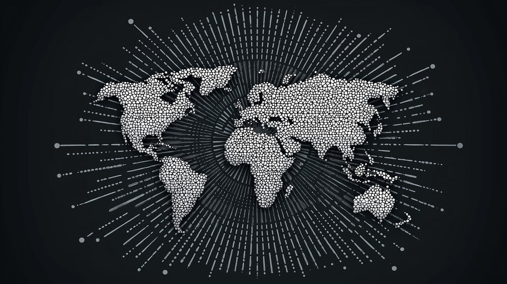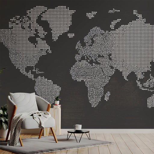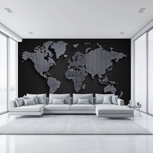 The Stippled Global Burst Mural Wallpaper is a dramatic and abstract map design. The continents are composed of tightly packed white pebble or cell-like shapes, set against a deep black background. Radiating lines and dots burst outward from the map's center, creating a strong sense of energy, power, and global reach. The use of pointillism to render the landmasses gives the piece a unique texture, while the monochrome palette maintains sophistication. This mural is ideal for a bold entryway, a study, or a office that requires a powerful, high-impact statement.