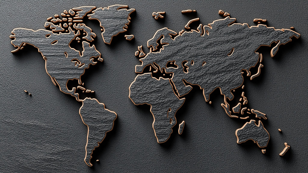Agrega un margen de seguridad de 6 a 10 cm. El área total se calcula en metros cuadrados y se redondea al número entero más cercano.Textured Slate World Map Mural Wallpaper | Copper Outline, Dark Monochrome Relief, High-Contrast Global Art