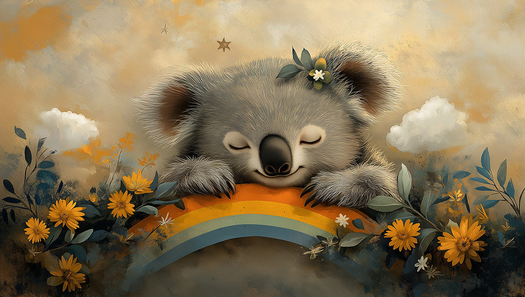 Este papel tapiz muestra un dulce koala azul durmiendo pacíficamente bajo un arcoíris colorido, rodeado de flores y nubes. El diseño es caprichoso y onírico, lo que lo hace perfecto para una sala de juegos. Puede estimular la imaginación de un niño y crear un ambiente divertido y atractivo. Los colores brillantes y el lindo koala añaden una sensación de alegría y asombro al espacio. Los colores en este papel tapiz son armónicos y crean una atmósfera visualmente estimulante y alegre. El koala azul contrasta bellamente con los cálidos colores del arcoíris, mientras que las flores y las nubes de varios colores añaden profundidad e interés. La combinación de estos colores funciona bien para crear un diseño cohesivo y atractivo.