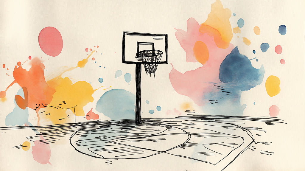 Agrega un margen de seguridad de 6 a 10 cm. El área total se calcula en metros cuadrados y se redondea al número entero más cercano.Aro de baloncesto acuarela Papel tapiz mural | Arte urbano juguetón