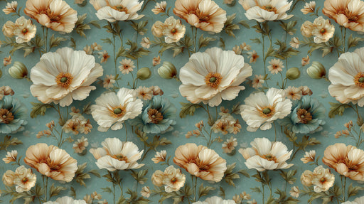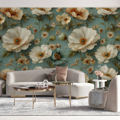 Fresco Murales de Peonías Vintage Elegante | Crema, Beige y Azul Turquesa de Serenidad