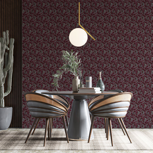 Ver todos los detallesPapel tapiz mural Silver Paisley Bloom | Elegancia dramática en borgoña