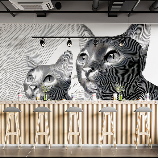 VIVAWALLSThe Cat Duo Line Art Mural Wallpaper is a sophisticated, close-up, and graphic artwork. It features two domestic cats rendered in a dense, flowing ...