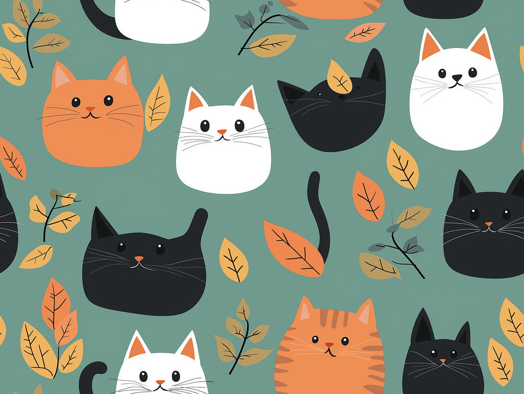 Este papel tapiz muestra un patrón juguetón de caras de gato en varios colores - blanco, negro y naranja - junto con hojas sobre un fondo verde. Las caras de gato tienen expresiones simples y lindas, creando una atmósfera divertida y alegre. En un dormitorio, agrega un toque caprichoso y acogedor. El patrón repetitivo puede ser visualmente relajante, mientras que los motivos de gato aportan un sentido de encanto y personalidad al espacio.