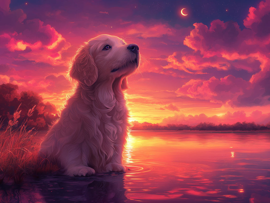 Este papel tapiz muestra un golden retriever sentado y mirando hacia el cielo durante un hermoso atardecer junto a un lago. El agua refleja los cálidos tonos del cielo, que está lleno de nubes rosas, anaranjadas y púrpuras, junto con una luna creciente. El mural crea una escena serena e idílica, evocando una sensación de paz y satisfacción. Puede transformar una habitación en un retiro tranquilo, siendo un gran complemento para una habitación o un espacio de vida relajante.