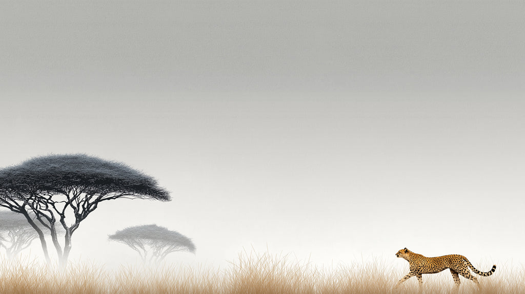 The Minimalist Cheetah Chase Mural Wallpaper is a refined and striking composition. The design uses vast negative space—a pale gray gradient—to emphasize the speed and isolation of a lone cheetah running across the bottom third of the frame. Acacia tree silhouettes loom gently in the mid-ground mist, providing context for the African savanna. The contrast between the subtle gray sky and the warm, defined foreground grass draws the eye directly to the cheetah's focused movement. This mural is ideal for a modern bedroom, a contemporary living space, or a minimalist room seeking a subtle yet powerful focal point.