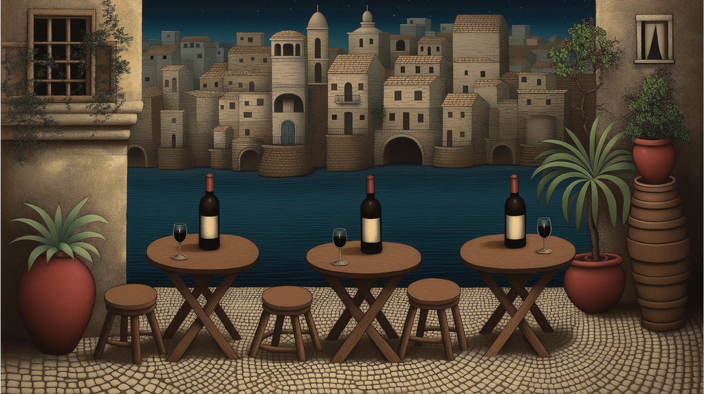 El papel mural del Murales del Pueblo de Piedra Nocturno es una ilustración detallada y con mucha atmósfera. La escena muestra una representación estilizada y fortificada pueblo mediterráneo construida con piedras apiladas, mirando hacia aguas azul oscuro bajo un cielo nocturno salpicado de estrellas. El primer plano es una acogedora terraza con tres mesas de bistrot de madera, taburetes y macetas de terracota enmarcando la vista. El estilo gráfico limpio y la paleta de colores terrosos limitada le otorgan a la escena una cualidad atemporal y ligeramente fantástica, sugiriendo un mundo antiguo y oculto. Este mural es ideal para un bar temático, una caverna masculina robusta o un restaurante sofisticado con un toque rústico.