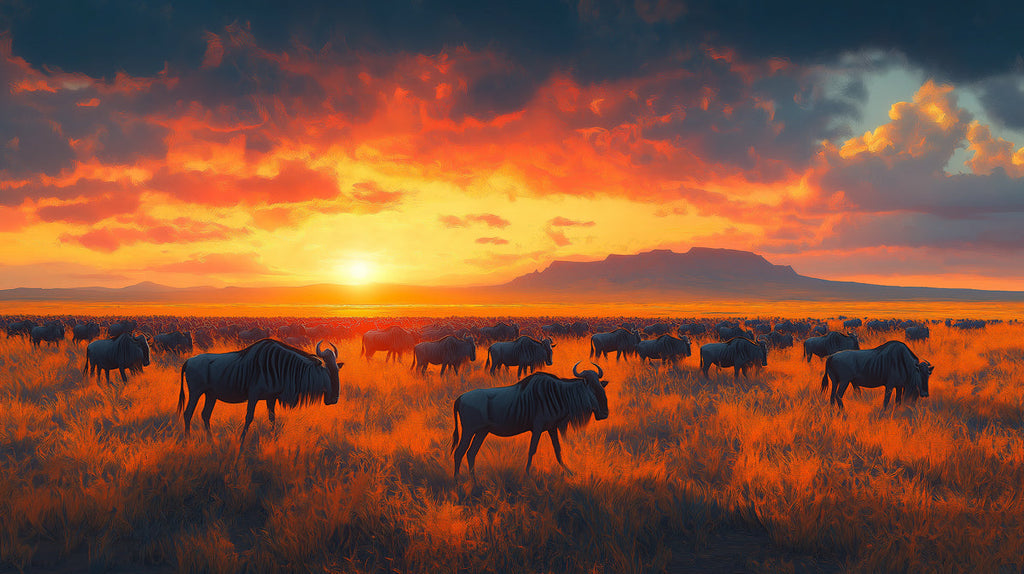 El papel tapiz muestra un rebaño de ñus en la sabana mientras el sol se pone detrás de una lejana cordillera. El cielo está lleno de cálidos tonos de rojo, naranja y amarillo, reflejándose en la hierba y creando un paisaje de tonos dorados. Los ñus están en diversas posiciones, sugiriendo movimiento y el ritmo de la vida en la sabana. En un salón, crea una atmósfera serena e idílica. La combinación de la vasta sabana, los ñus migratorios y el hermoso atardecer puede transportar a los ocupantes al corazón de África, haciendo que el espacio se sienta más tranquilo y conectado con la naturaleza.