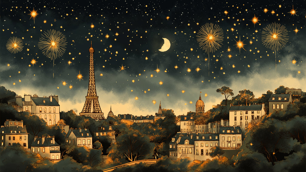 Este hermoso papel tapiz, pintoresco, muestra una vista romántica y amplia sobre los tejados de París. La Torre Eiffel se eleva majestuosamente desde un mar de encantadores edificios y árboles de la ciudad, todo bajo un mágico cielo estrellado. La escena está iluminada por una luna creciente y festivos fuegos artificiales dorados, creando una atmósfera profundamente romántica, soñadora y llena de asombro.