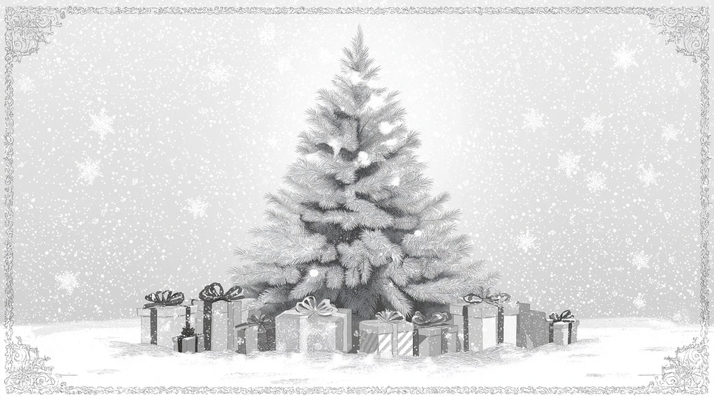 Este elegante fondo de pantalla monocromático captura la tranquila magia de una Navidad nevada. Renderizado en un delicado estilo de lápiz o grabado en tonos plateados y grises, un hermoso árbol de Navidad se alza rodeado de regalos. La intensa nevada y el elaborado borde enmarcan la escena bellamente, creando un aspecto que es atemporal, sofisticado y serenamente festivo.