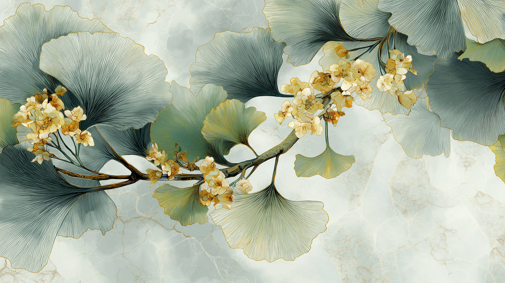 Agrega un margen de seguridad de 6 a 10 cm. El área total se calcula en metros cuadrados y se redondea al número entero más cercano.Murales de papel tapiz de rama de ginkgo en flor abstracta | Arte botánico elegante con mármol