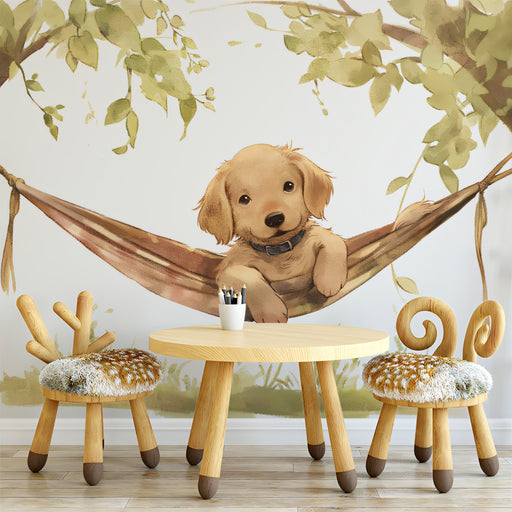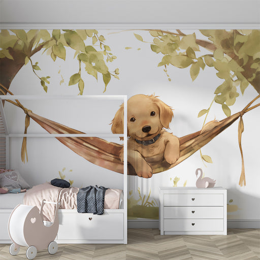 Ver todos los detallesPapel tapiz mural de un adorable Golden Retriever en una hamaca | Arte de cachorro lindo