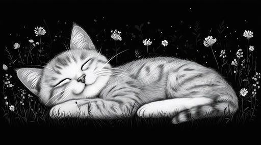 VivawallsEste papel tapiz presenta un gran gato durmiendo sereno sobre un fondo negro con delicadas flores blancas y hierba. El esquema de colores monocromá...