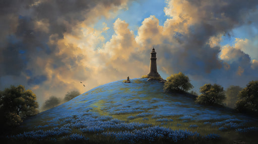 Vivawalls StoreSet a dramatic tone with this painting of a lighthouse perched atop a hill covered in blue flowers. The scene is illuminated by a stunning, cloud-f...