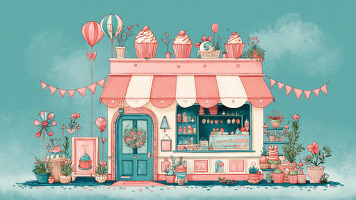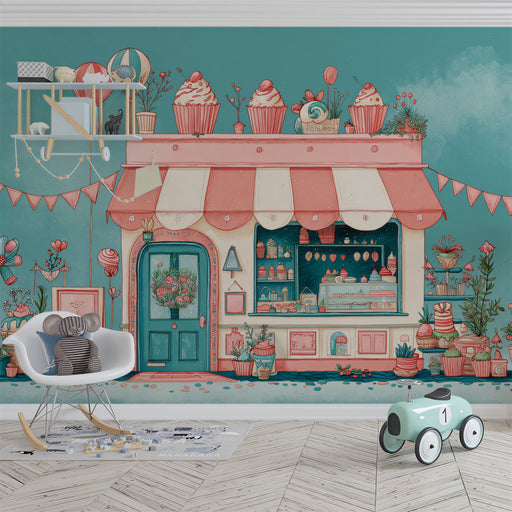 Festive Cupcake & Sweet Shop with Balloons Wallpaper | Cheerful Confectionery Boutique