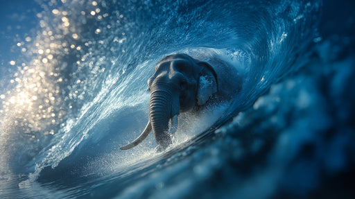 Ver todos los detallesPapel tapiz mural de elefante y surfista dentro de una ola tubular | Alta acción, Fantasía iluminada por el sol, Azul intenso