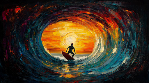 Ver todos los detallesMurales de Papel Tapiz de Ola Barril de Fuego y Hielo | Atardecer de Alto Contraste, Silueta de Surfista, Arte Impasto