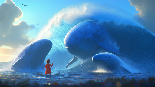 VIVAWALLSThe Giant Whales Fantasy Surfing Mural Wallpaper is a breathtaking and dreamlike artwork. It captures a child on a tiny surfboard facing three mass...