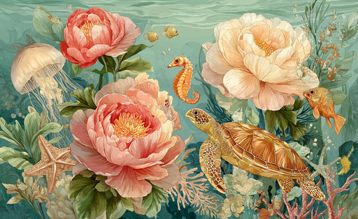 Ver todos los detallesMurales Románticos Submarinos | Tortugas Marinas y Flores de Peonía