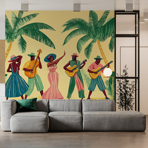 Fondo de pantalla mural de baile tropical | Vibe caribeño retro con palmeras y músicos