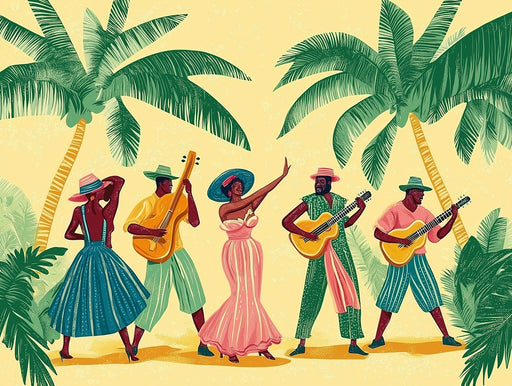VivawallsInfunde tu espacio con el encanto soleado de la Caribe a través de esto Fondo de pantalla mural de baile tropical , mostrando una alegre reunión de...