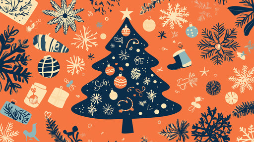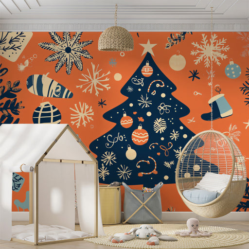 Mural de papel pintado con una mezcla navideña de arte popular | Naranja y azul marino