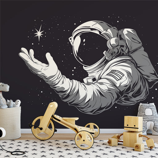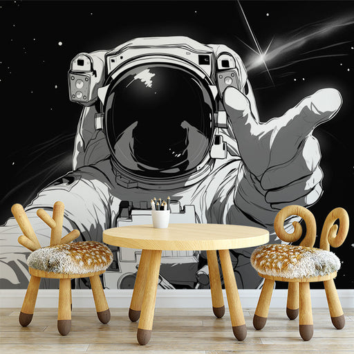 Ver todos los detallesPapel tapiz mural de astronauta en blanco y negro para una sala de juegos | Astronauta en negro, blanco y gris
