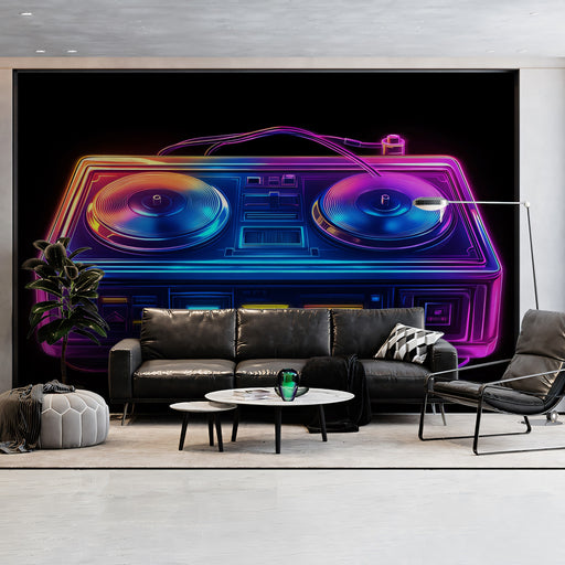 Ver todos los detallesPapel tapiz mural de pista de DJ brillante | Paisaje sonoro neón futurista