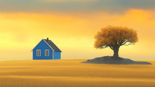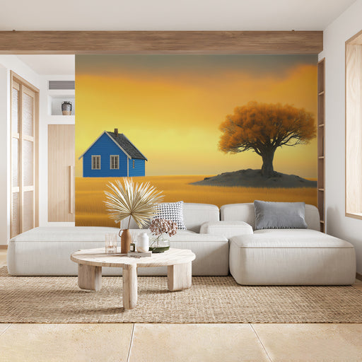 Papel tapiz mural de Casa Azul y Árbol de Otoño | Paisaje minimalista con campo dorado