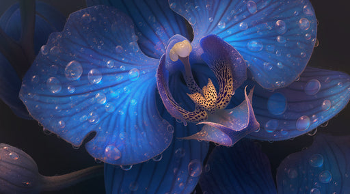 VivawallsEste fondo de pantalla presenta orquídeas rosas grandes y vibrantes con gotas de agua sobre un fondo azul. El diseño es elegante y llamativo, añadi...