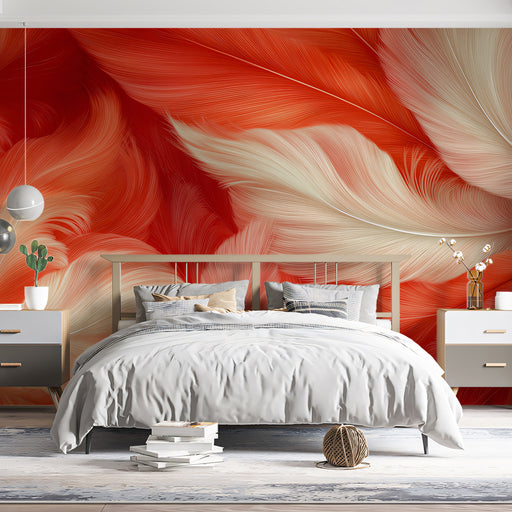 Murales de papel tapiz abstracto de plumas naranjas y blancas | Arte dinámico fluyendo