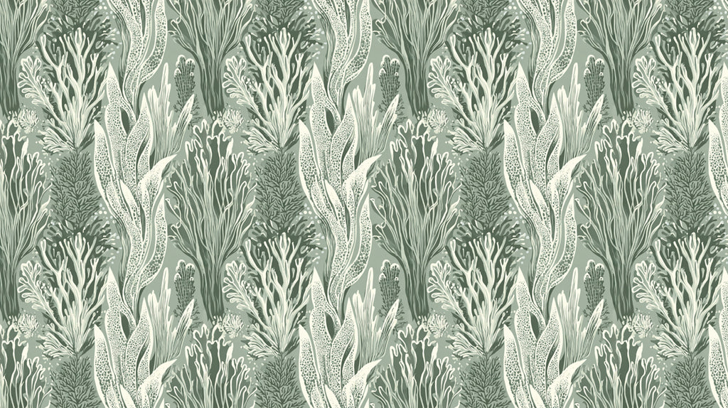The Abstract Seaweed Mural Wallpaper is a captivating and organic piece of art. The design features a dense, repeating pattern of stylized kelp and coral-like shapes in a soft, high-contrast palette of deep forest green and creamy off-white. The hand-drawn texture and layered forms create a sense of tranquil depth and underwater elegance. This mural is an ideal choice for a serene bathroom, a peaceful reading nook, or a contemporary living room that seeks a touch of natural, timeless beauty.