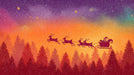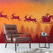 The Abstract Sunset Sleigh Ride Mural Wallpaper is a striking, stylized winter scene. Santa's sleigh and reindeer are rendered in a dark silhouette flying above a shadowy, maroon/red forest. The sky is a bold, abstract gradient of fiery orange, yellow, and deep purple, suggesting a dramatic arctic twilight or aurora. The simplified, high-contrast composition gives the scene a modern, graphic, and highly energetic feel. This mural is ideal for a bold entryway, a modern bedroom, or a space where color and drama are prioritized.