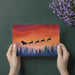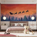 The Arctic Twilight Sleigh Ride Mural Wallpaper is a picturesque, stylized winter scene. Santa's sleigh and reindeer are dark silhouettes against a glowing sky that transitions from bright orange/red near the horizon to a deeper hue above. The foreground features a dense, layered forest rendered in cool shades of blue and indigo. The blend of warm sky and cool ground creates a beautiful, serene, and modern holiday aesthetic. This mural is ideal for a casual dining area, a bedroom, or a living space with a sophisticated, contemporary style.