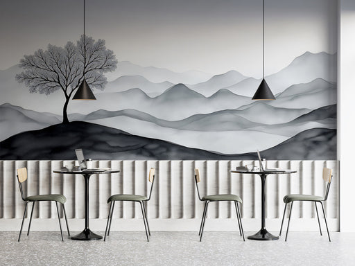Black and White Rolling Hills with Tree Mural Wallpaper | Minimalist Monochrome Landscape